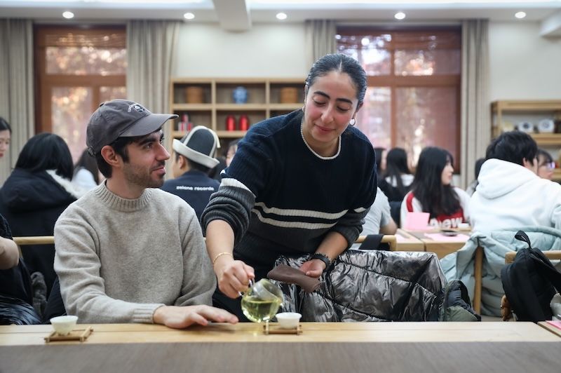 该活动不仅展示技艺本身,也注重文化背景与精神内涵的讲解。在茶文化体验环节,留学生在学习冲泡技巧的同时进一步理解了茶文化中的礼仪与审美。有学生主动起身尝试泡茶,并为不同国家的同学们倒茶。