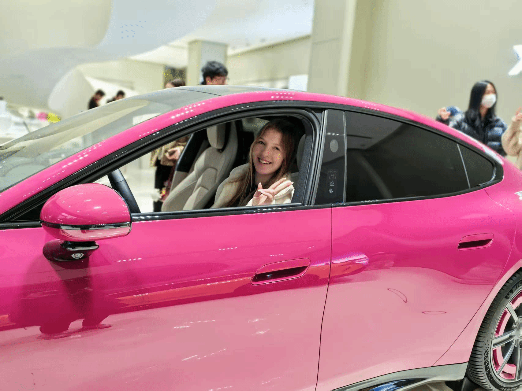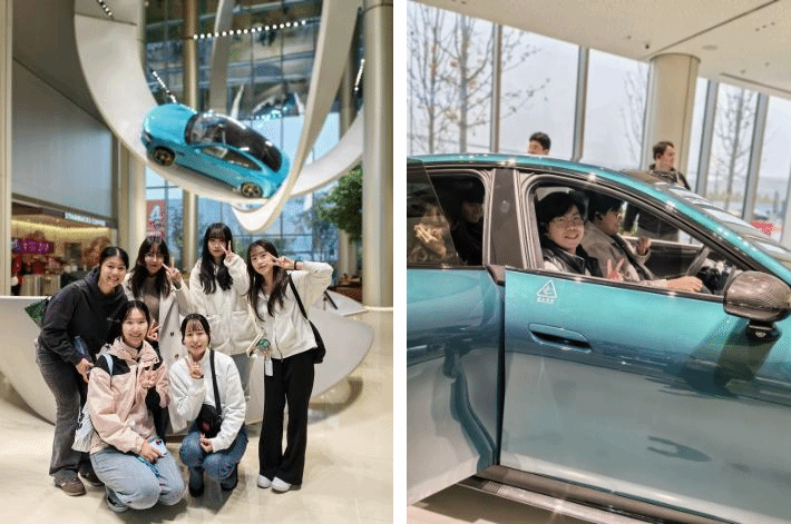 在综合楼展厅,在专业讲解员的细致介绍下,学生们深入了解了小米跨界造车的背景以及小米电动汽车的研发历程、设计理念、技术创新和安全标准,并亲身试乘小米SU7,体验“人车家”全场景智能联动功能。大厅内悬吊的莫比乌斯环展台与海湾蓝SU7车型,也成为学生的打卡热点。