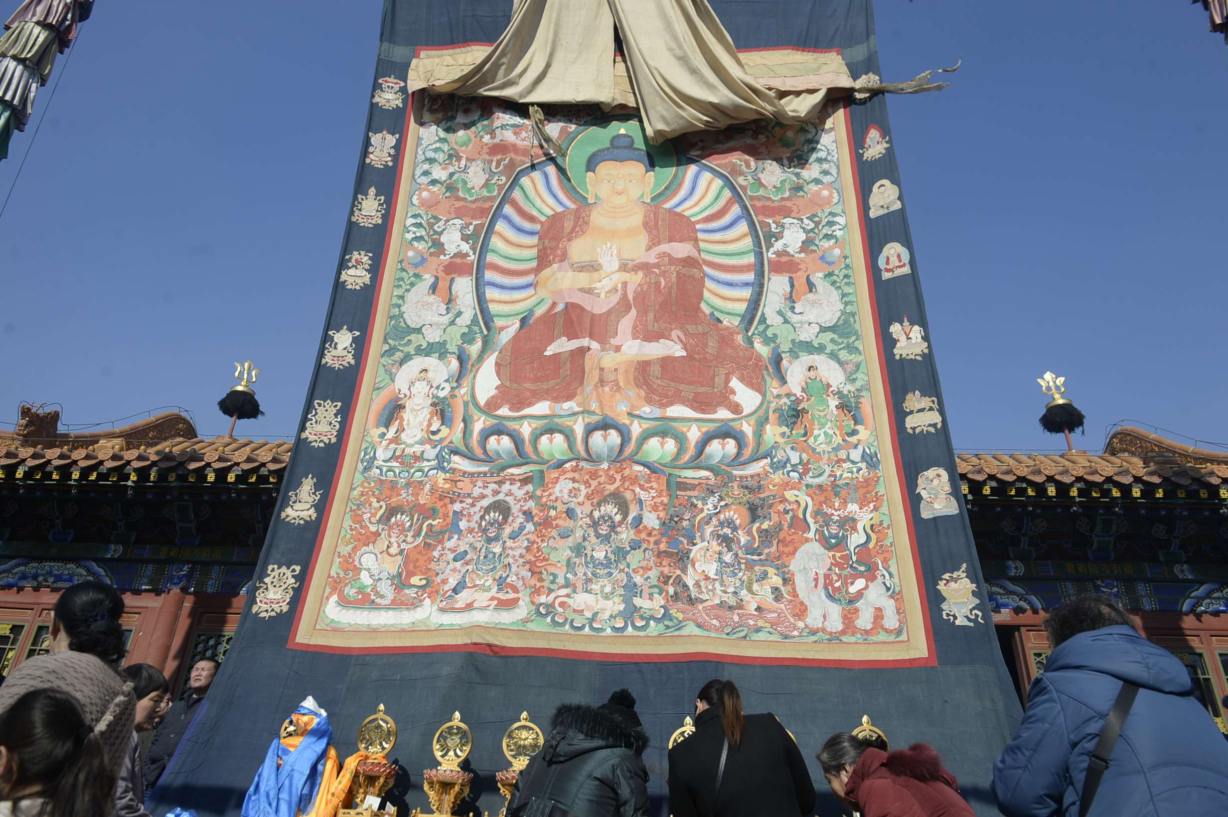 内蒙古呼和浩特大召寺举行晒大佛法事活动。(资料图)中新社记者 刘文华 摄